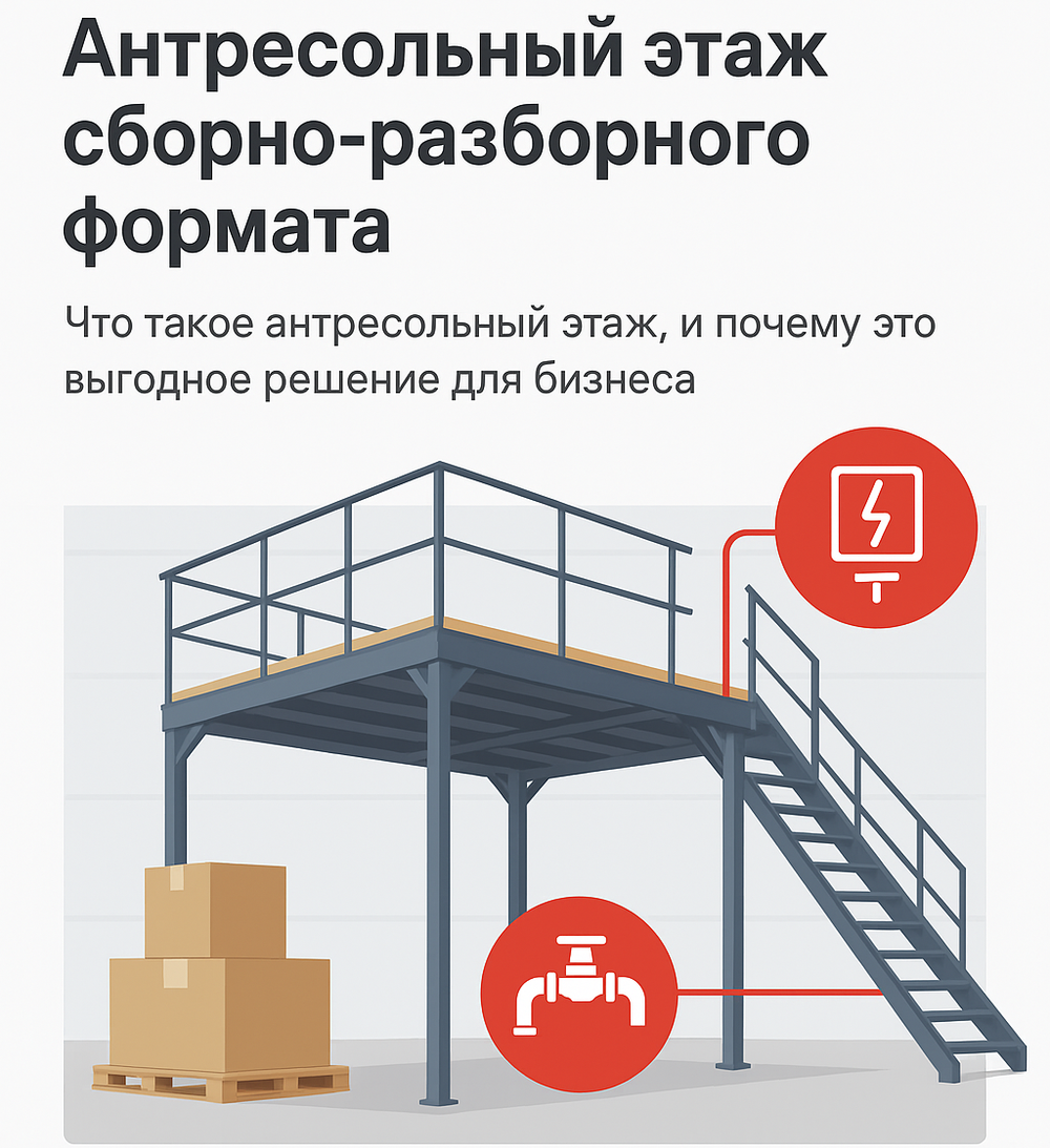Сборно-разборные антресольные этажи — это оптимальное решение для бизнеса, которое позволяет увеличить полезное пространство без лишних затрат и бюрократии. Они не требуют обязательного узаконивания, собираются и разбираются, как конструктор, имеют автономные коммуникации, площадь может превышать 40% помещения и полностью адаптируются под задачи вашего предприятия.